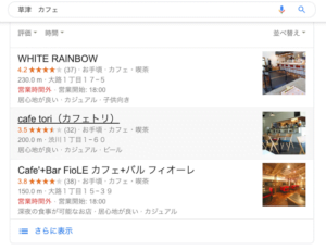 例えば、草津市にあるカフェに行きたい!となったときに、GoogleMapを見れば、パッと見て、お店の位置や営業時間、評判を確認することができます。