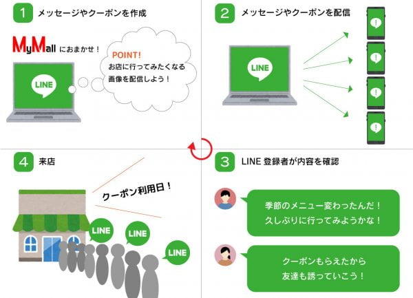 LINEは若年層を中心に利用者がとても多いツールですのでうまく活用していきたいですね!公式LINEツールの活用に不安がある方はぜひ公式LINE代理店のマイモールにご相談ください。メッセージ画面の作成やクーポンの作成・配信方法の補助はもちろん、お客様に合わせた公式LINEツールの使い方もご提案しております。